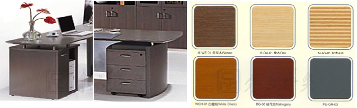 ※ 獨特而時尚,木制行政人員書桌主要由一張兩側微弧形的桌面以兩旁灣間隔板組成,前面四分之三高度的面板配以啞面銀色,而附加的桌面由掩門式或開放式的小文件柜以放置電腦主機。多元化的儲物配置包括活動文件柜、掩門地柜或地柜由中抽屜、上層架及兩邊掩門構成,另有歸一設計的組合柜包括下部掩門、玻璃門及上部開放層架,同款弧形設計的會議桌可選擇附加線纜儲存系統。