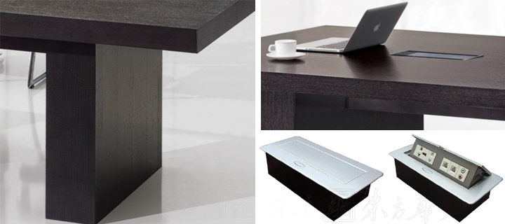 ※ 上圖為黑橡木開放漆工藝,厚實穩重的會議臺,彰顯大氣,牢固美觀,木析紋理和質感表現得更為淋漓盡致,紋理渾然天成,色澤自然,臺面可配多功能手動線盒,方便辦公,內部配置可根據需要選配:萬能插口,網線口,麥克口,視頻口等。