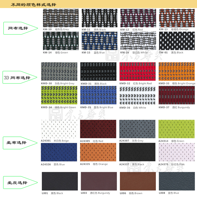 背墊、腰枕及座墊均為高級黃牛面皮;黑色塑膠框架,TPU扶手墊;頭枕插條、頭枕橫把手、背支撐架、扶手墊支撐座、扶手升降按鈕、扶手內管、底盤支撐架均為鋁合金精拋光;100MM氣壓棒,340MM鋁合金精拋光椅腳,65MM PU滑輪;
