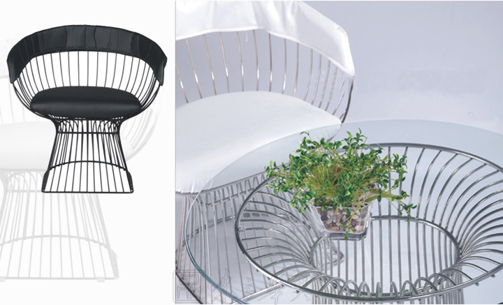 實心鋼架表面高溫鍍鉻,金屬線交叉編織、固定于彎曲的金屬線上,背部及坐位配坐墊;