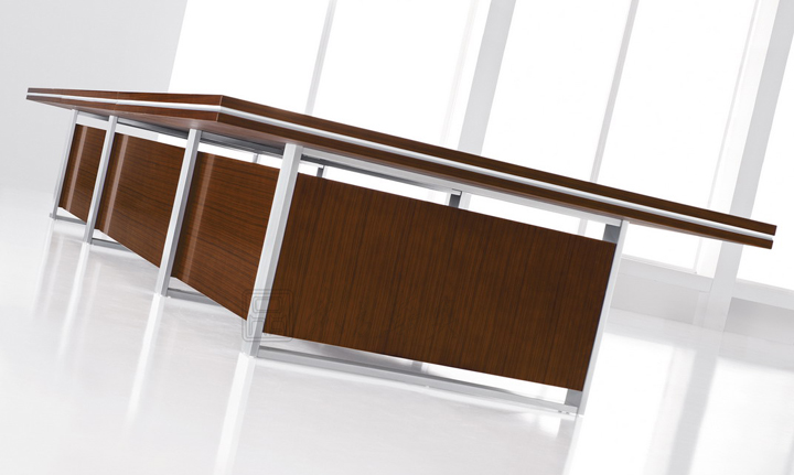 ※ 上圖為會議桌角度展現,此款會議桌木紋鮮明,配以銀色為點綴,獨特的線形設計韻含了一種靈氣,使人眼前一亮。多元化的桌面設計能滿足您各種組合變換、空間互補的要求。